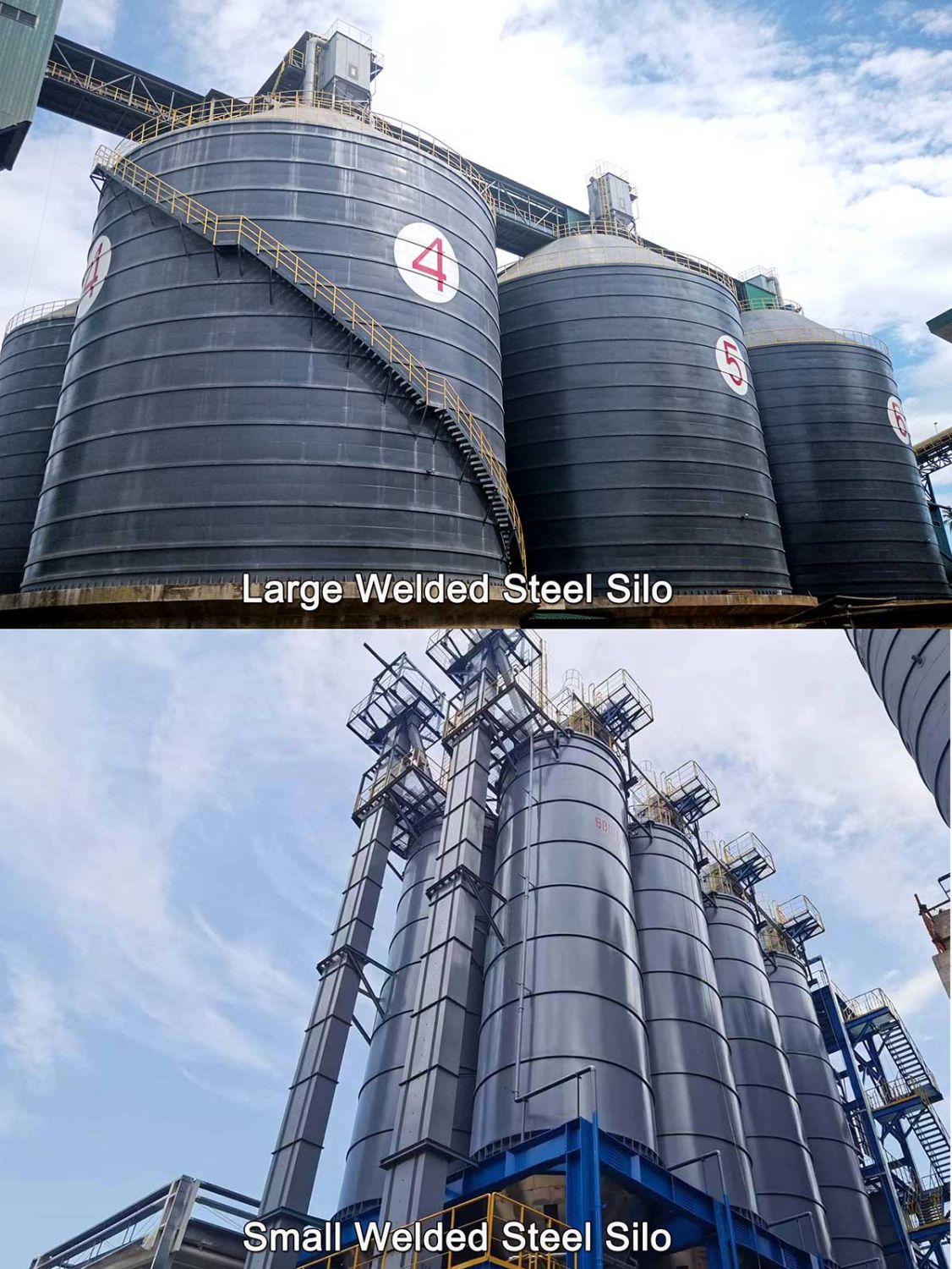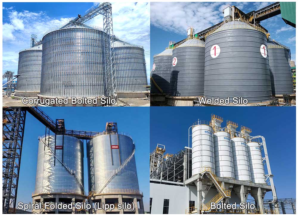 Common silo types: mainly bolted steel silos, spiral folded steel silos (Lipp silos), and welded steel silos.