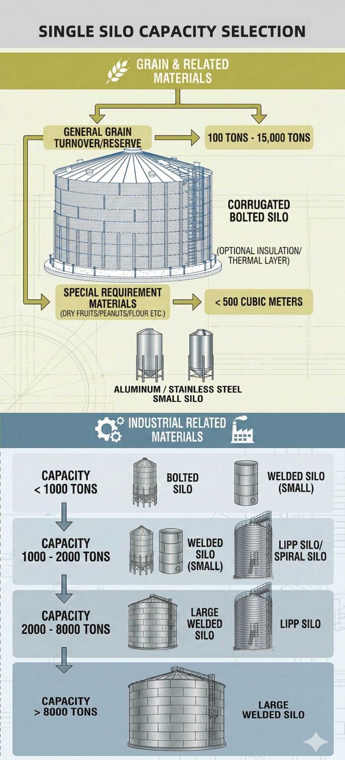 Grain 1,000–2,500 t / industrial granular 1,000–2,000 t: both possible—decide by operation mode and budget.