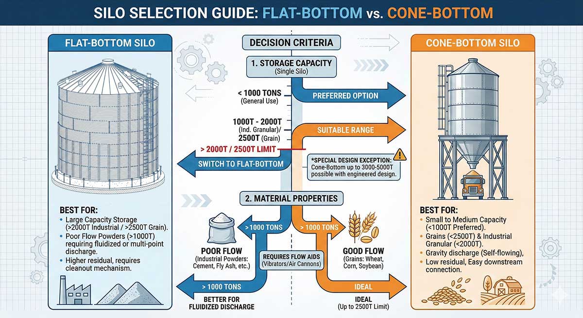 If the main purpose is long-term reserve storage and capacity is about 1,000–3,000 t (grain) or 1,000–2,000 t (powders), prioritize flat-bottom silos for better economy and layout flexibility.