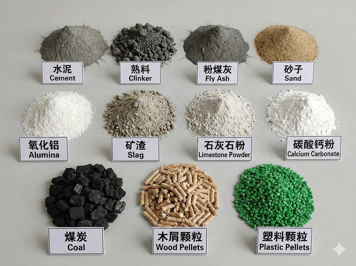 Stored materials: cement, clinker, fly ash, limestone, calcium carbonate, alumina, steel slag powder, coal, plastic pellets, wood pellets, and many other industrial bulk materials.
