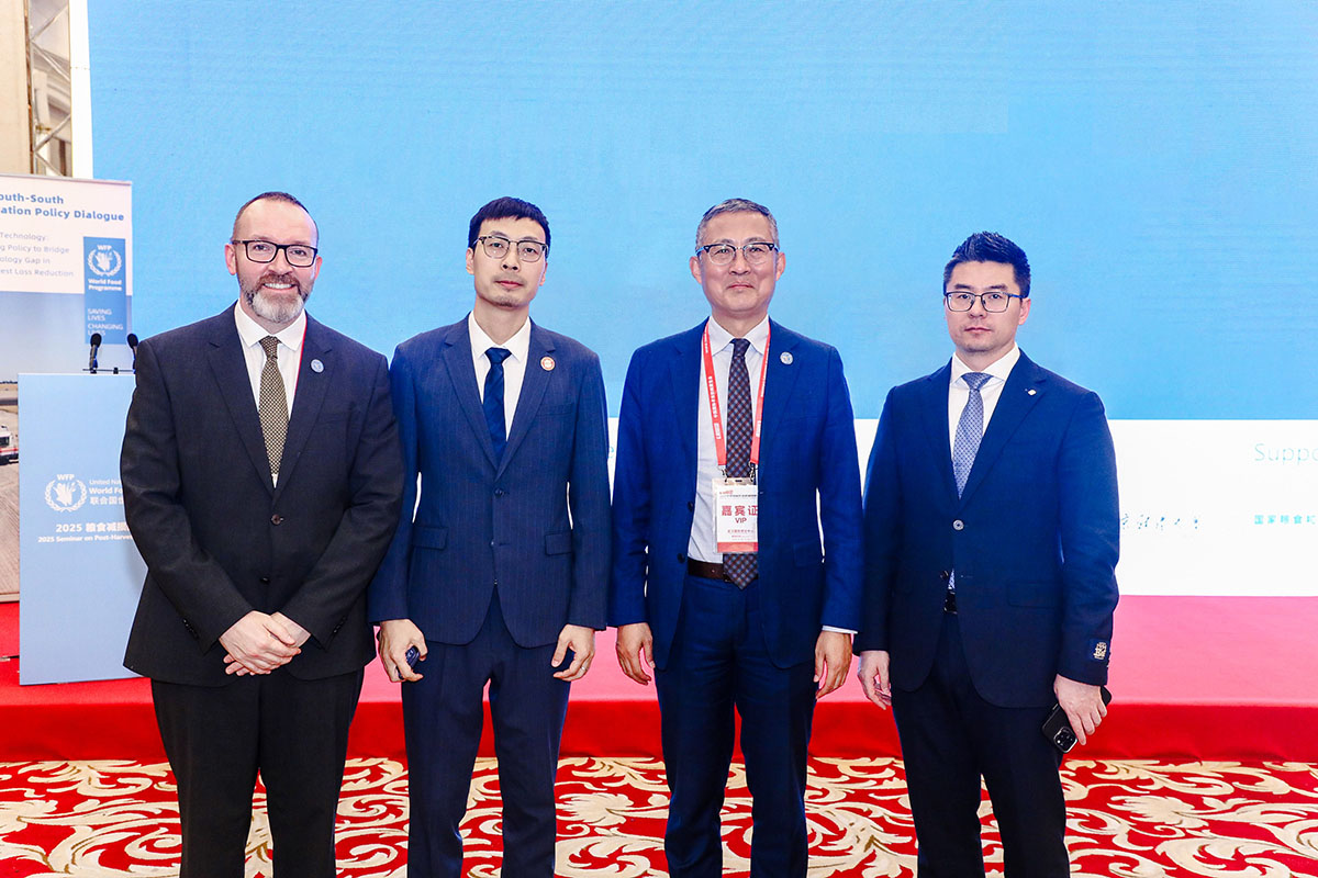 Representatives from SRON posed for a photo with Zhao Bing, Representative of the United Nations World Food Programme in China, and Simon Clements, Deputy Director of the World Food Programme China Office