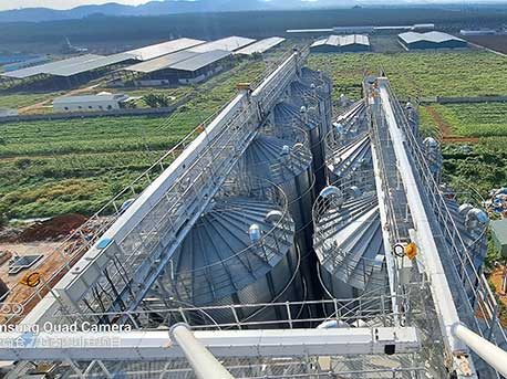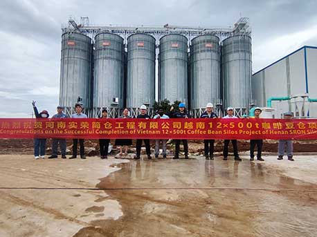 The project is 12*500 tons coffee silos in Vietnam, the owner is large coffee production company. which is a company specializing in the production and export of instant coffee, roasted coffee, dole robusta and arabica coffee beans. The whole project includes the design, manufacturing and construction of 12 silos of 500 tons each, and their supporting systems such as conveying, cleaning, receiving and sending, packaging, electric control, etc. Our company has taken the storage characteristics of coffee into full consideration in the pre-design stage, and strictly monitored and managed the temperature and humidity in the silos, so as to achieve the real-time monitoring of the quality of coffee.