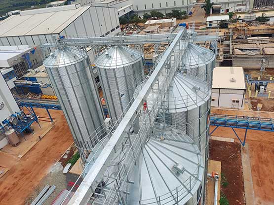 the project includes the design, manufacture and project construction of 6 silos of 500 tons and their supporting conveying, automatic bag cutting, electronic control and other systems. During the project design process, our company fully considered the storage characteristics of coffee beans, and combined with the customer's demand for bagged incoming materials, long-distance conveying, and full automation, developed a scientific and reasonable design scheme, solved the problems of large retention and high labor cost that may occur in the centralized incoming materials, dust collection, and long-distance conveying, and ensured the smoothness and economy of the material conveying, which was highly recognized by the owner. Vietnam 6x500t Coffee Beans Steel Silos