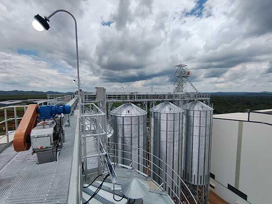the single silo capacity of 500t and a total silo capacity of 3,000t, and the storage material is coffee bean. The project is divided into feeding from bag cutting machine, bag cutting, lifting, conveying, into the silo, out of the silo, into the workshop and electronic control system. The system reserves the position of 6 identical steel silos and equipment interface, which is convenient for later expansion. At the same time, in order to effectively control the quality of storage materials, our company has equipped mechanical ventilation system and temperature measurement system in this storage system, which is convenient for the owner to check the status of materials and control the quality of materials at any time.